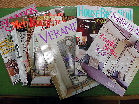 I have a good excuse to read interior design magazines. They are where I get a lot of inspiration for decorating, design, color, decorative painting, murals and a whole host of other ideas. Here are just a few that I use. My favorites are Veranda, Southern Accents and House and Garden, which sadly has ceased publication.