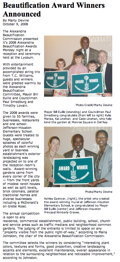 I am so pressed for time that I don’t have time to write anything for today, so I’ll post an article that Marty DeVine wrote for the Alexandria Times, regarding the Beautification Awards given by the City of Alexandria, VA this past Wednesday evening.