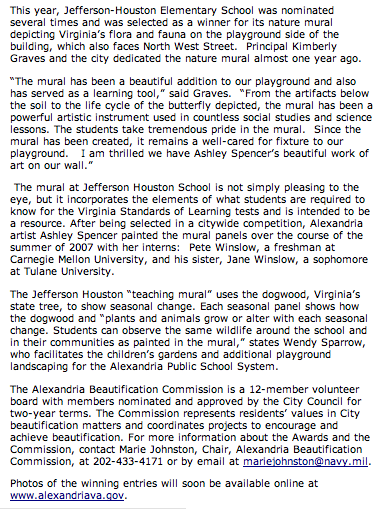 My neighborhood school, Jefferson Houston, where I painted a 50 foot long mural on multiple panels, received the only public school award for beautification. This is the picture that I used in my most recent Casart Fall eNewsletter, which can be downloaded here. It mentions the mural and my new business line.