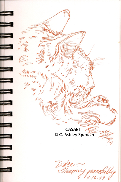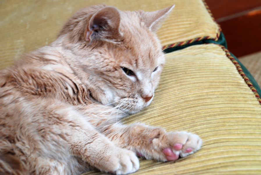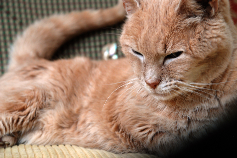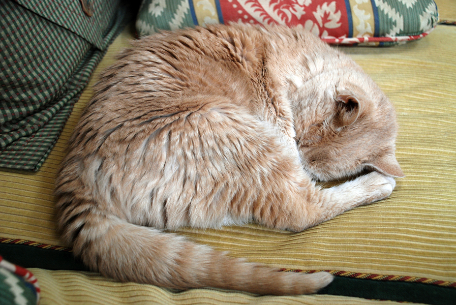 This is a hard post to write, especially before the fact, so I couldn’t do it last night. I am trying to emotionally prepare myself for having to put our 20 year old cat, Dolce, to sleep. Dante, our 13 year old cat, died around this time last year on his own at home, but it was painful. I thought Dolce would go before him, but after throwing an embolism at the vets just from getting a urine sample last week, I brought her home and she perked up and even walked down and up the basement stairs. She’s in renal failure but she continues to defy all odds. Our vet wanted me to put her down right then and there but I felt that after living 20 years, she deserved to die at home. Luck has been on her side. When I saw her at the pound she was in a litter of three kittens but I couldn’t take more than one. When I went back to pick her up the next day, they had put the other two to sleep because they had colds. She is my family’s first pet — almost as old as my oldest son. We’re having another vet who makes house calls come by today. We’ve comforted her this past week and I even asked one of my photoshop gurus to come by with his wife, who runs a pet sitting service, to help me administer fluids. They were lifesavers. The bag is now empty but Dolce continues to eat tuna, although she’s starting to turn away, and she’s drinking water. Her body is shutting down and she can barely walk. She looks like she’s just had enough. I have a lot of respect for her will to live and strength. She’s never been a complainer. In fact, we named her for her mild temperament. She’s transformed from a somewhat scared pound cat to an independent, wise, old lady cat. I’ll be sad without her keeping me company, but it is in her best interest to stop her misery. It’s one of the hardest decisions to make as a pet owner. Although we will no longer have any pets when she is gone, except our leporinus fish — just not the same, and I will be outnumbered by males in the house, I will continue to reflect affectionately on her many years of companionship and joy that she’s brought our family. It’s hard to believe this time is finally here.