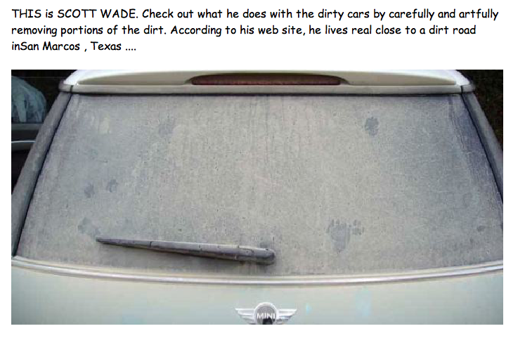 A friend sent this email to me with Scott Wade’s take on dirty windows. Pretty remarkable work, but like sand or chalk, not meant to last: