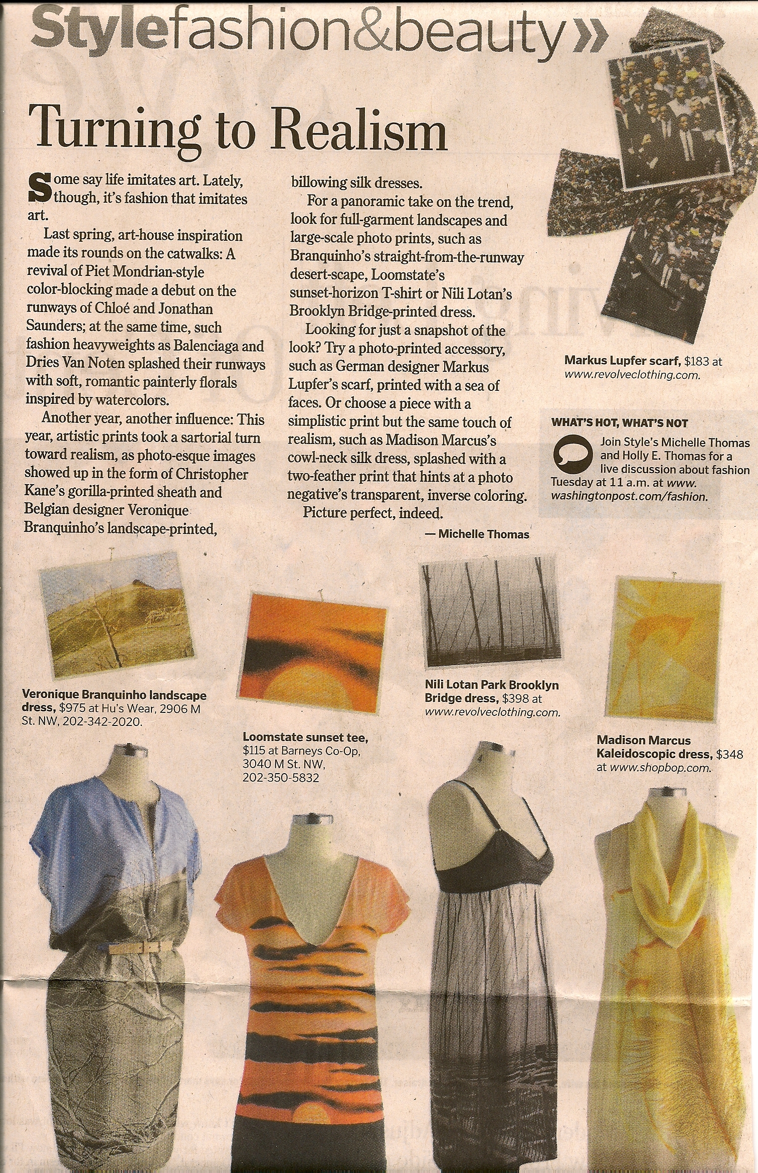 Life imitating art, or art influencing fashion? There were many examples of the latest apparel using pictorial images printed onto fabric in the Style section recently. Tops, dresses and scarves are being made with printed photos. I like this idea, maybe since I’m doing something similar with wall coverings. See our custom page with personal photos that can be uploaded as well as our own casart™ images.