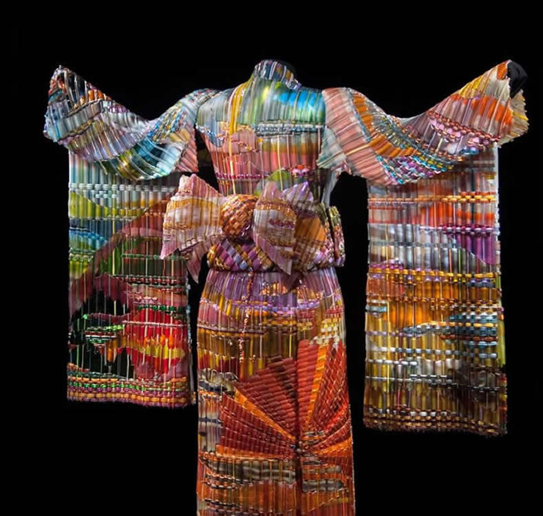 Well, this Ring Toss dress by Lee Rinnenger really caught my attention. It’s made with rings of porcelain and metallic thread. How stunning!