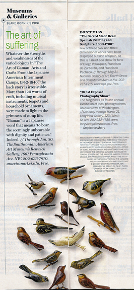 I was unfamiliar with the arts that came out of the Japanese American Internment Camps. This is the theme of The Renwick exhibit, The Art of Gaman, Arts and Creafts from the Japanese American Internment Camps, 1942 – 1946. There are more than 120 pieces that were produced by the prisoners to lessen the grimness of their camp life. These include musical instruments, household ornaments, teapots and craft objects. Gaman in Japanese means “to bear the seemingly unbearable with dignity and patience.” I’ve just added a new word to my vocabulary. This new discovery, new word of the day and these birds are very inspirational for one of my new designs that I’m working on for Casart coverings. I couldn’t have asked for better timing. This is exhibit is on view from March 5 – January 30, 2011.