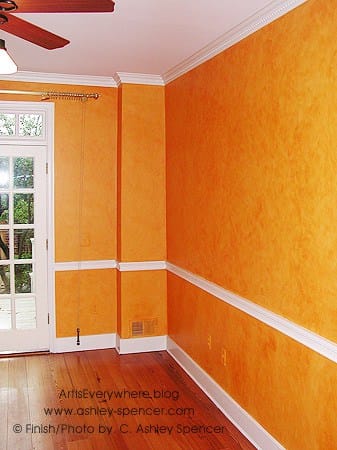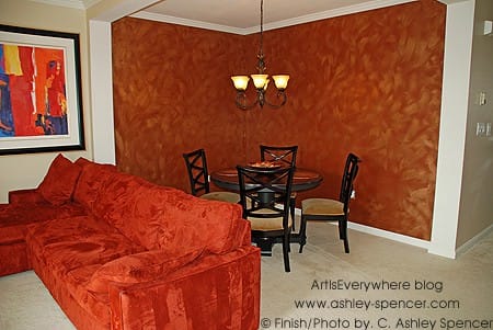 I had been hired recently to replicate fall leaf colors in a decorative finish for a client. The oranges and yellow combos I did were bold and bright (represented in a previous client’s work below). It was difficult to introduce the red without obliterating the other colorwashes, however, and without actually painting something figurative, such as leaves. Here’s an example of a wall finish that I did for a client with red and metallic highlights, inspired by fall colors and another one with a suede-like beige with gold flecks. It was soft and reminded me of feathers. Lots of inspiration comes from leaves, Nature and fall colors.