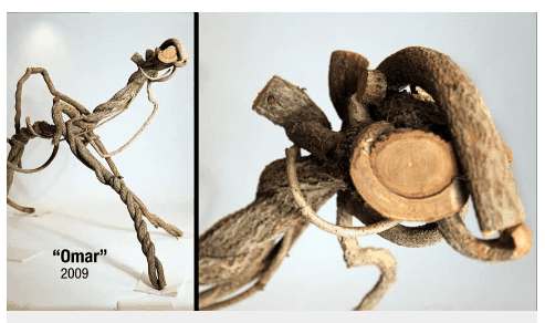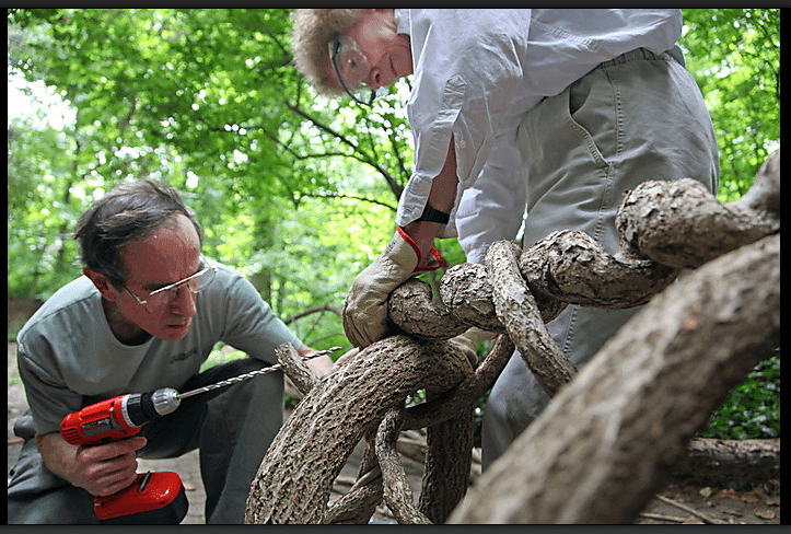 I like most any kind of art that is truly innovative, so I was intrigued when I read the article about Seth Goldstein and Paula Stone, a husband and wife “weed warrior” team, as they call themselves. They scavenge the woods looking for gnarly vines and branches that they collect to compose one of a kind, organic sculptures. They mostly collect bittersweet because it is extremely invasive for trees. Being retired engineers, who happened to meet while swing dancing, they know how the twists and turns of putting these things together. In doing so, they appear to be helping save trees in the process.