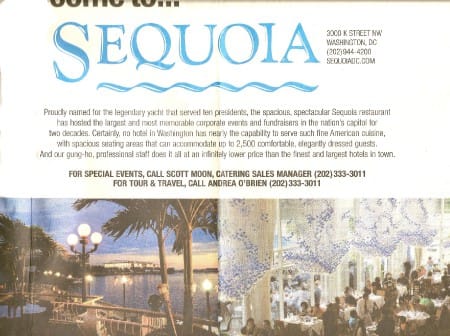 The [USS] Sequoia is also the name of the the Presidential Yacht — until it was sold to a private owner and then repurchased by the US Government to be used for event rentals — when not being used by The President and his family. A little side note: the private owner of this glamorous yacht purchased an auction item to use my illustration services nearly 25 years ago. We coordinated but unfortunately, he never used it.