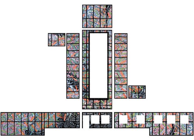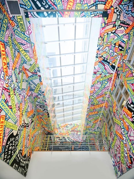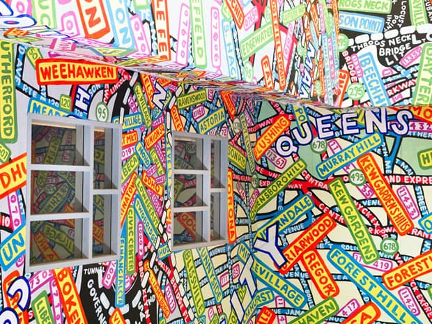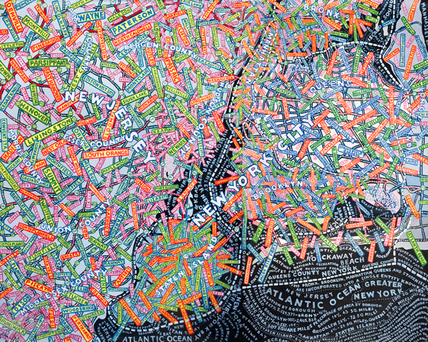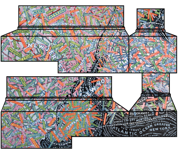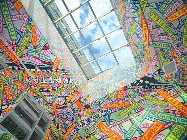 “These works marry my love of painting maps with my love of environmental design,” says Scher. “When the viewer enters the atrium, they have entered the painting. They are enveloped by it. Space is altered by it. For that moment in time, all perspectives are skewed. The viewer gets to inhabit Queens in a manner at once, totally familiar and bizarre.”