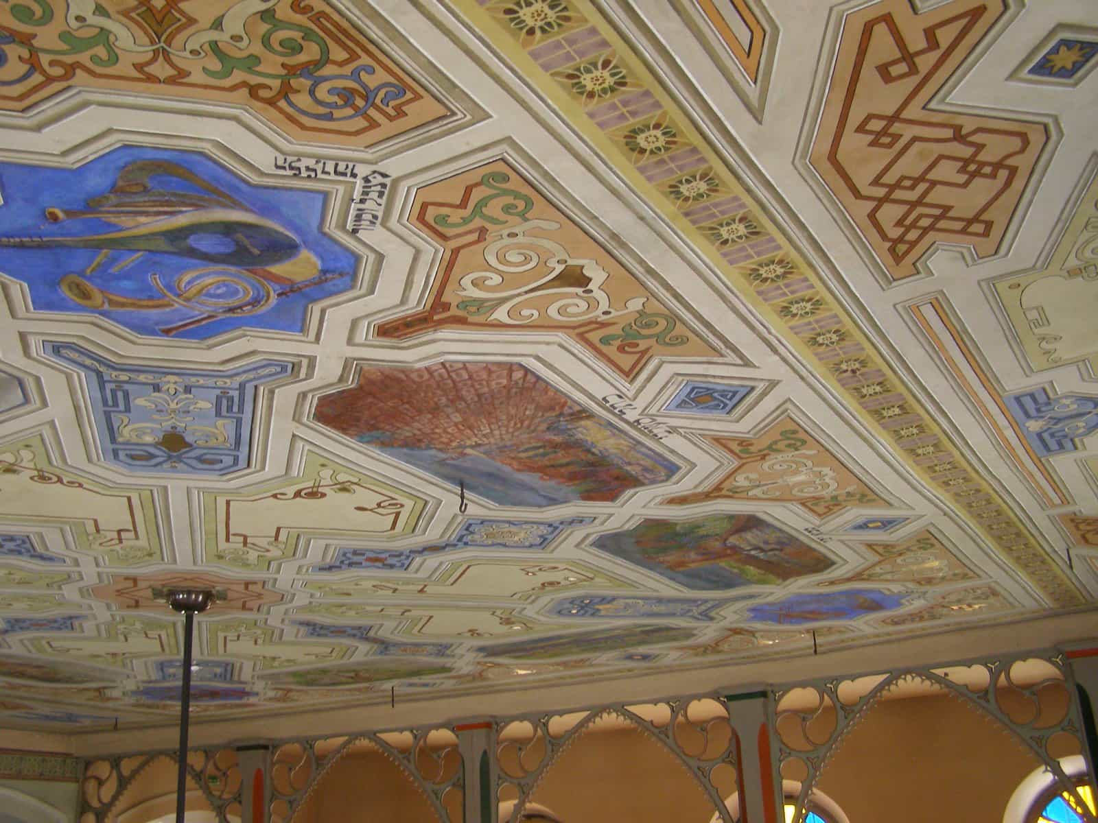 These beautiful ornamental murals can be found adorning the The Kupa Synagogue in Krakow, Poland. They are highly ornate and display  great graphic design as well as wonderful use of trompe l’oeil with faux painted drapes and columns. I love all the colors that were used.