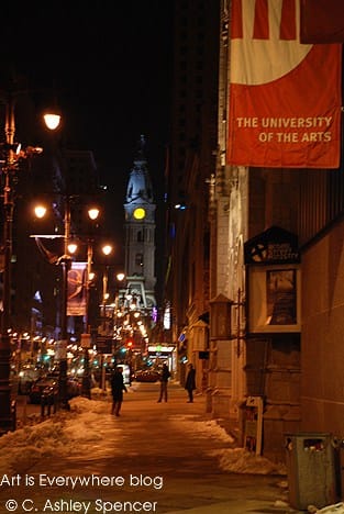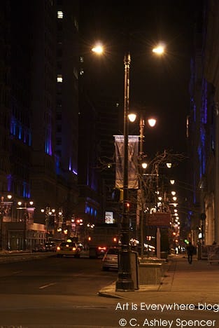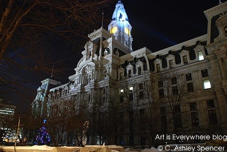 We then toured most of the murals around our location. It was a challenge to find them at night. I’ll post on this next Mural Monday. Afterward, we toured up and down Broad Street to City Hall and back and really enjoyed the time-sequence, light display. Unfortunately, this is the only family picture we took — those three figures waiting for me in the distance.