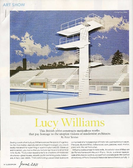 I remember seeing Lucy Williams’ artwork a while back in my Elle Décor magazine. I was immediately taken by the architectural, three-dimensional nature of her work. Her work is pristine and geometric and yet jumps out of its boundaries.