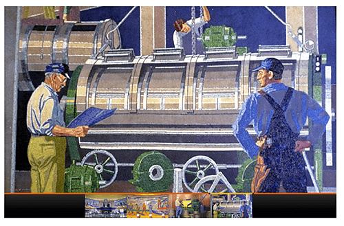 Similar in style to these murals are ones by German-born artist Winold Reiss, who was commissioned to create mosaic murals for the Cincinnati Union Terminal, which now houses the Omnimax Theater. It’s hard to believe that these are all mosaics — until you look closely. Each mural is 105 feet long and depicts industries that were important to Cincinnati at the time, such as Baldwin Piano, Proctor & Gamble and US Playing Cards (who knew).