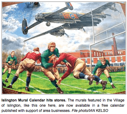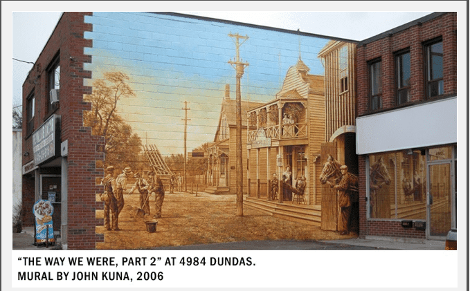 Toronto’s Village of Islington is built around 15,000 square feet of “historically pictorial” murals. Each mural tells a story and depicts an age-gone-by time period. These are both endearing and well-executed educational stories in paint. They were conceived by the BIA, Business Improvement Area to beautify and promote Islington Village. They’ve done a fabulous job, worth me traveling to see when I’m able to take that trip that I’ve been wanting to to Canada. Just look at the horse coming out from the corner of the two buildings.