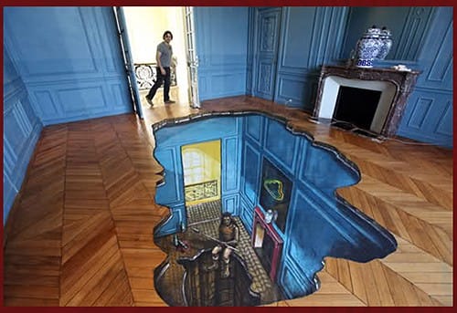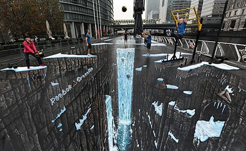 The largest 3-D street mural was entered into the Guinness Book of World Records this past November. It’s by artists 3D Joe & Max. It measures 9,106 square feet. Evidently over 300,000 others have tried to break this record, according to the Huffington Post. This mural below uses anamorphic perspective — painted in a purposeful distorted, “slanted” way that offers a 3D optical illusion when viewed from a certain vantage point.