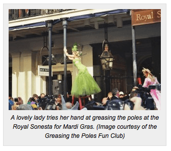 However, this next tradition is one of which I was completely unaware. I guess my parents must have sheltered me while growing up in New Orleans. Actually, I do remember parade-goers shimmying up poles to catch beads but maybe this was before “greasing the poles” was started. Who knew a whole artistic performance could be created — only in New Orleans!
