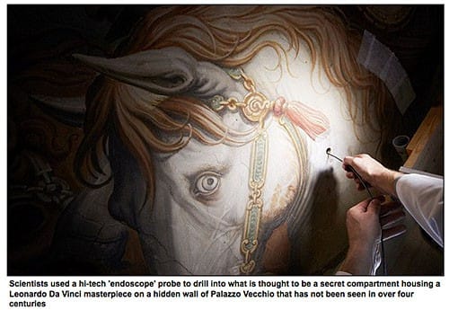 Leonardo da Vinci was a master painter and a technical genius with his talent. He is known the world over for his artistic masterpieces. Imagine the delight of the art world that recent evidence supports that one of his long lost murals, The Battle of Anghiari, has been discovered behind a false wall with Georgio Vasari’s painting, The Battle of Marciano, in Florence’s Palazzo Vecchio. Read further on psychorg.com on exactly how it was discovered. It was scientific technology that helped make the discovery possible, and of course funding and support led by the National Geographic, University of California, San Diego’s (UCSD) Center of Interdisciplinary Science for Art, Architecture and Archaeology (CISA3), in partnership with the City of Florence. UK’s Daily Mail Online shows very descriptive picture.