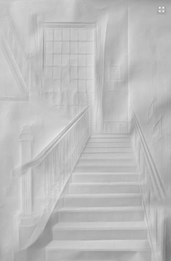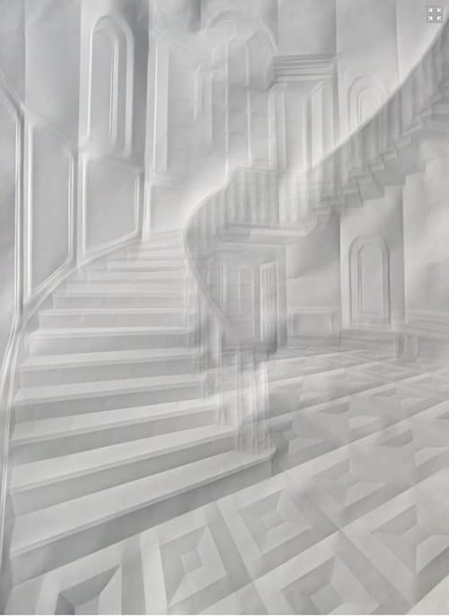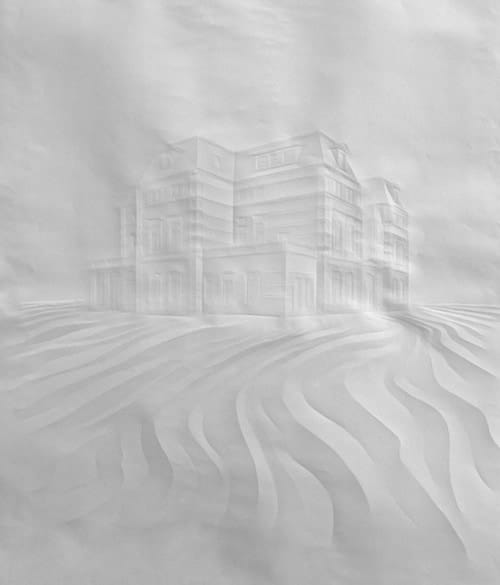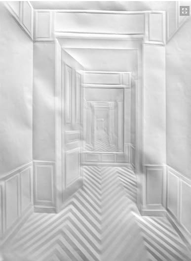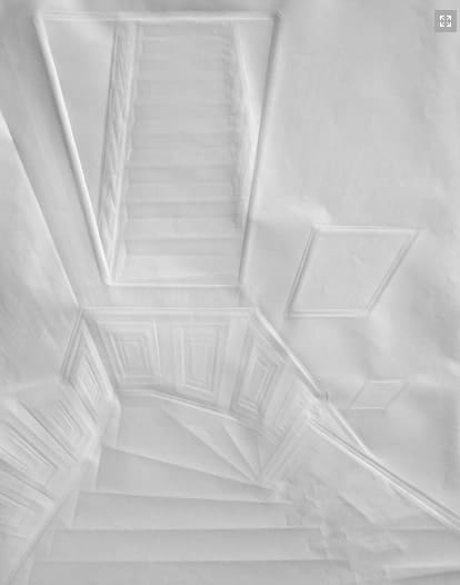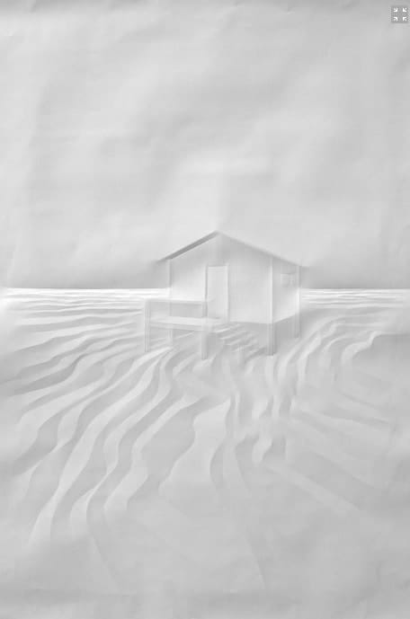 Unlike origami, this kind of paper folding leaves a visible, non-3-D impression, raised but on flat paper. The artwork is architectural and arresting. I can’t figure out how they were created without producing unwanted creases in the paper. Beautiful. They remind me of images captured in the sand….maybe because I’m heading to the beach, finally. Fortunately, these are here to stay. Take a look.