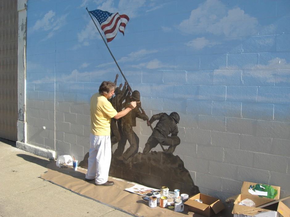 This Veterans Mural was painted by James Shepard in Terre Haute, Indiana. It reflects iconic images from the famous flag raising of Iwo Jima, seen here in the DC area with the sculptural memorial in Arlington. These pictures show stages toward completion.
