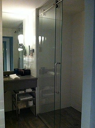 I love the open surface, barn-type-track, glass doors for the bathroom and shower and the mirror is exactly what I’ve been looking for with a low profile for our own bathroom. Fortunately, I can purchase some of the Kimpton Style décor items through their website, where I will definitely be shopping soon…
