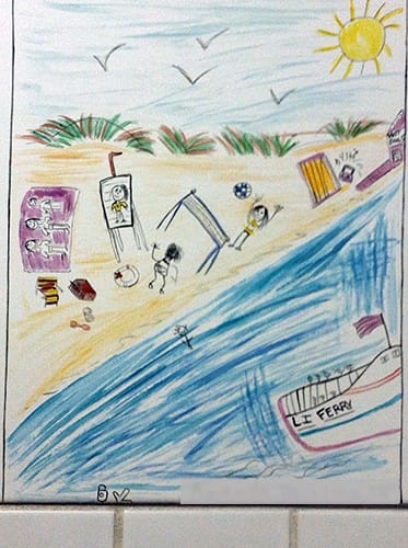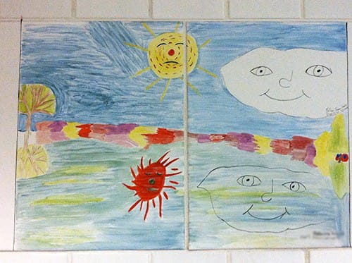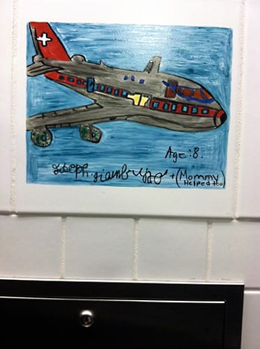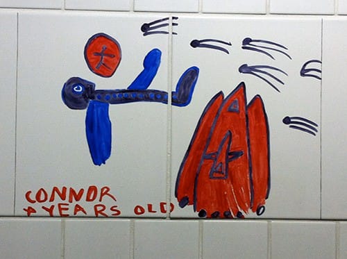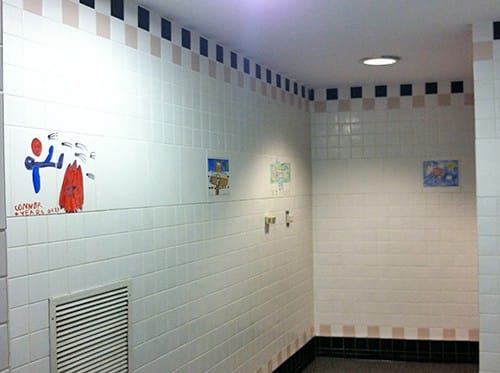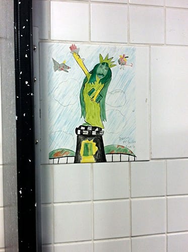 Little did I know I’d find more artwork in the most unexpected of places — the ladies’ restroom! Tiles of children’s artwork line the walls.