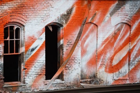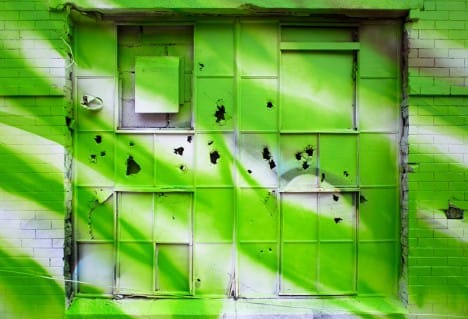 Often her brightly painted, abandoned warehouse buildings covers up existing graffiti and makes them look better if not more interesting.
