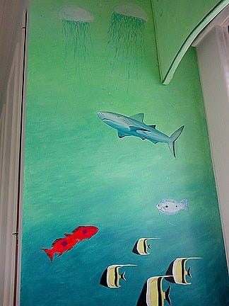 I’m both fearful and in awe of great white sharks and the majesty they intrinsically hold. Here’s my rendition in a mural I painted some time ago for a client on her son’s bedroom wall. It’s part of a two panel piece framing the window with more sea life represented.