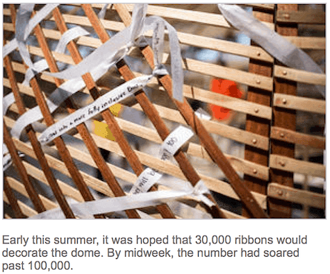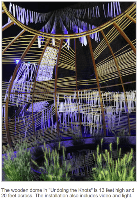 Meg Saligman’s impressive public artwork, Undoing Knots, was on display during the Pope’s visit at Basilica of St. Peter and Paul. It is composed of over 100,000 individual ribbons with handwritten personal struggles that are tied to the 13 feet high and 20 wooden framework that encircles the basilica dome.