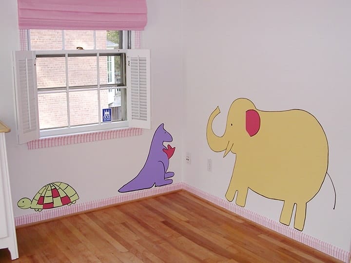 Category: Before & After Transformations - Murals, Lettering & Accents, MuralsTag: animals, decorative accents for child's room, girl's room, hand painted elements, lettering, nursery, plaid molding