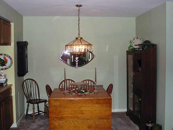 After: With pearlized, iridescent stripes, the dining room appears sophisticated and elegant. The stripes are narrow, which gives the illusion of added height to the space. Because they are brushed on with a pearlized glaze, the existing paint color did not need to be changed, and they change color throughout the day depending on the amount of light that is reflected on them. They shimmer, particularly at night.