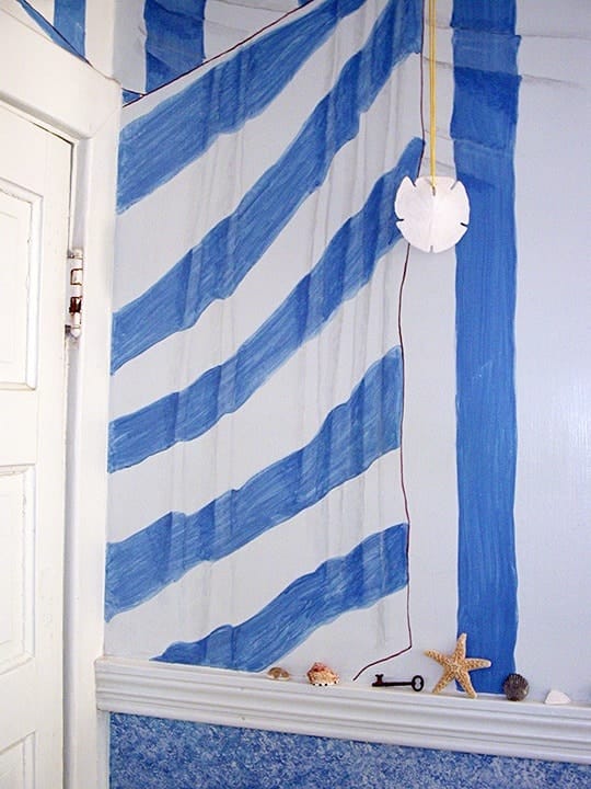 This trompe l’oeil tent cabana adds interest to a small space and recalls the charming days of colorful striped, beach cabanas.